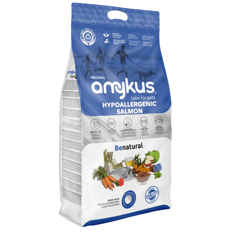 Amykus Gourmet Hypoallergenic Grain-Free Salmon je popolna in uravnotežena hrana, ustvarjena posebej za odrasle pse z občutljivo prebavo ali alergijami na hrano. Njena formula temelji na visokokakovostnih virih beljakovin iz lososa in sleda, ki so znani po svoji visoki prebavljivosti ter vsebnosti omega-3 maščobnih kislin. Zaradi tega je hrana primerna za pse, ki imajo težave s prebavo ali ne prenašajo žit, obenem pa zagotavlja energijo in vitalnost za vsakodnevne aktivnosti.
