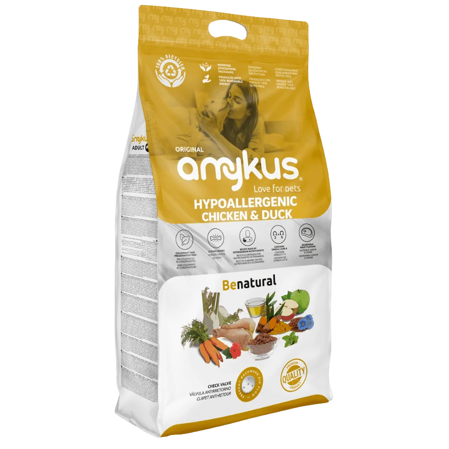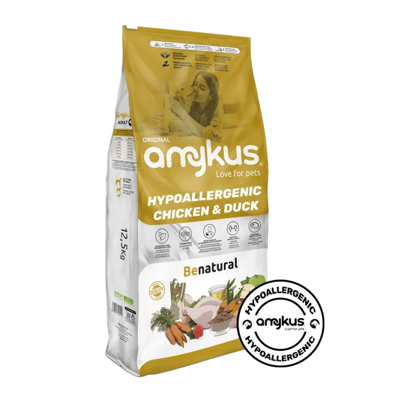 Amykus Gourmet hypoalergena hrana brez žitaric s piščancem in raco je popolna izbira za odrasle pse z občutljivo prebavo ali prehranskimi intolerancami. Receptura temelji na kakovostnih beljakovinah visoke biološke vrednosti, ki so lahko prebavljive in podpirajo mišično maso ter splošno vitalnost. Ker je brez žit, glutena in stranskih proizvodov, zagotavlja naravno, uravnoteženo in varno prehrano za vsakodnevno uporabo.