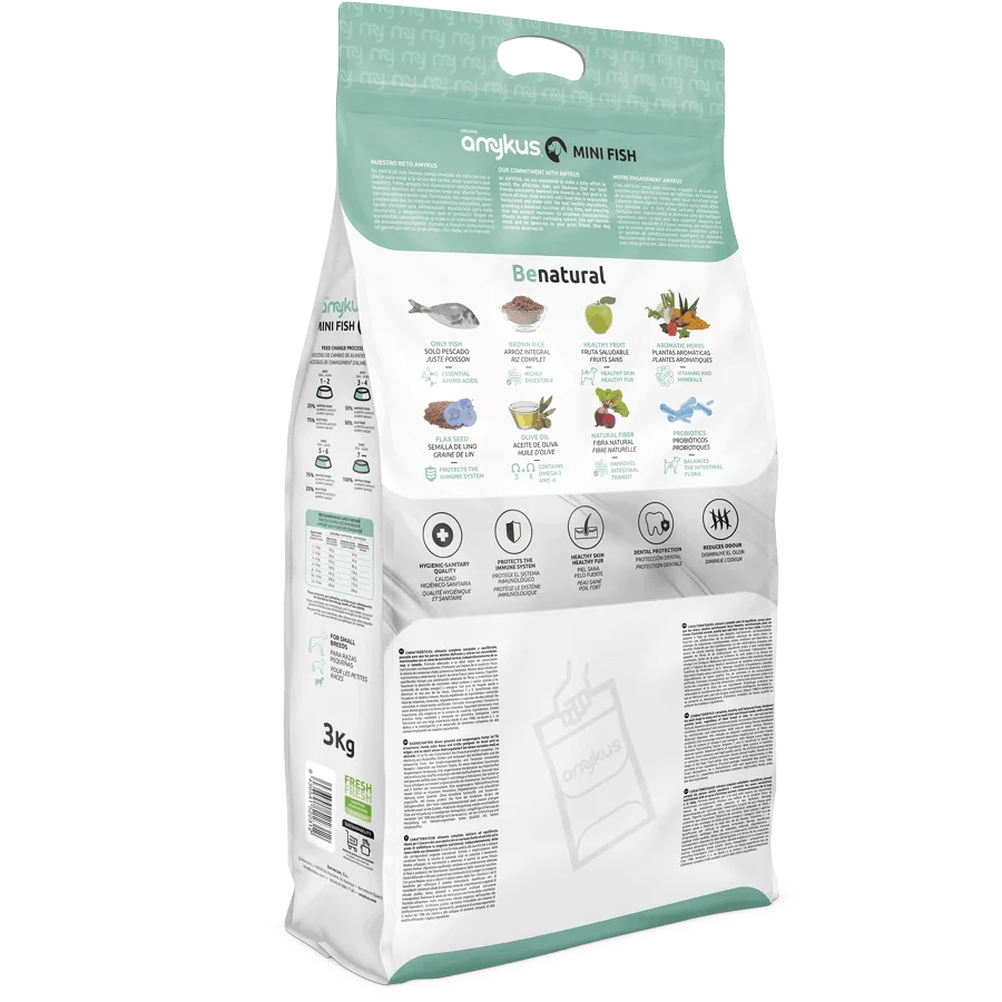 Amykus Original Mini Fish je posebej oblikovana hrana za odrasle pse majhnih pasem, ki združuje kakovost, okus in skrbno uravnoteženo prehrano. Zaradi svoje sestave, kjer več kot 90% beljakovin izvira iz rib, hrana zagotavlja izjemno prebavljivost in hkrati skrbi za ustrezno mišično maso. Majhne pasme psov imajo posebne prehranske potrebe, saj so praviloma bolj aktivne in porabijo več energije, zato ta hrana nudi dovolj hranil za vsakodnevno vitalnost.