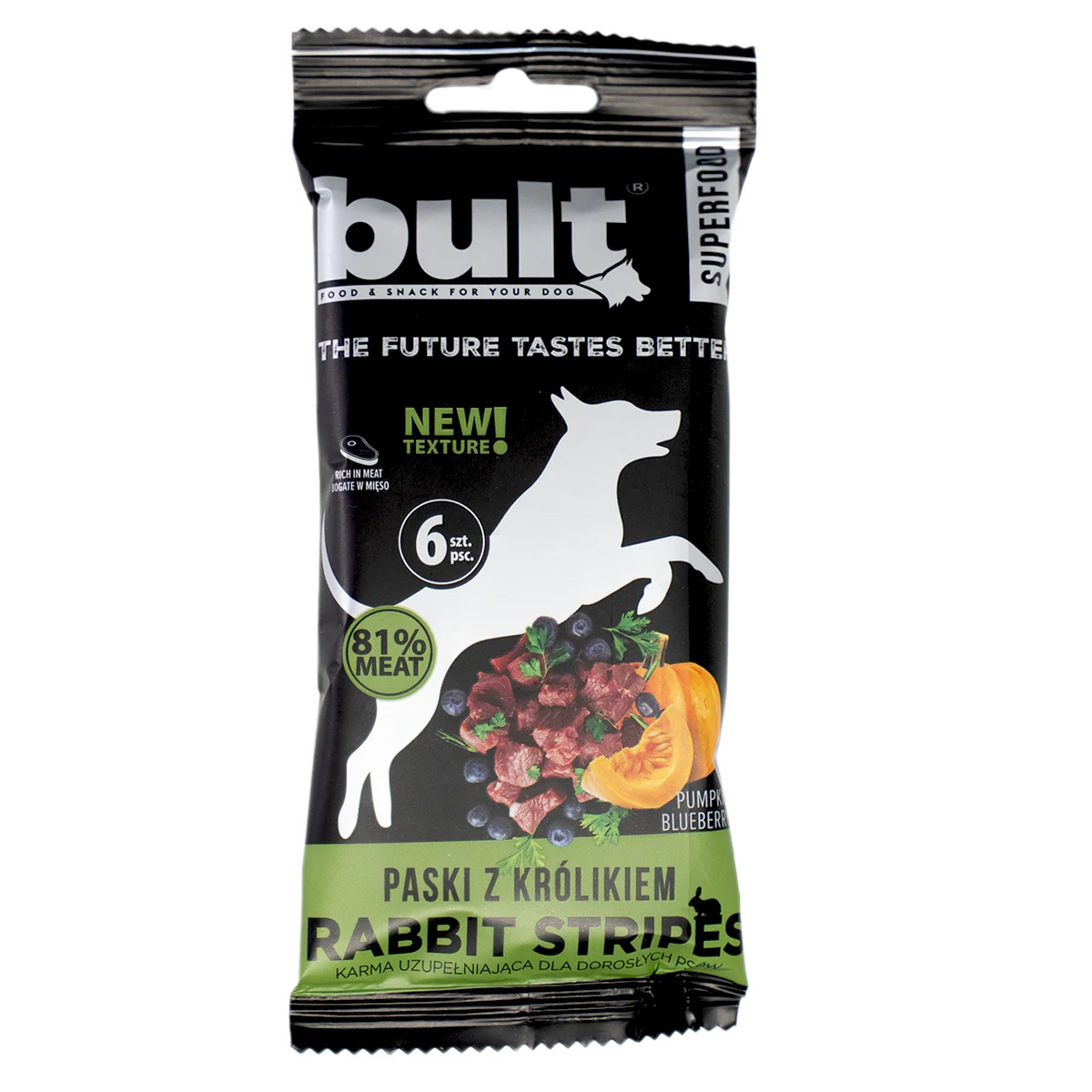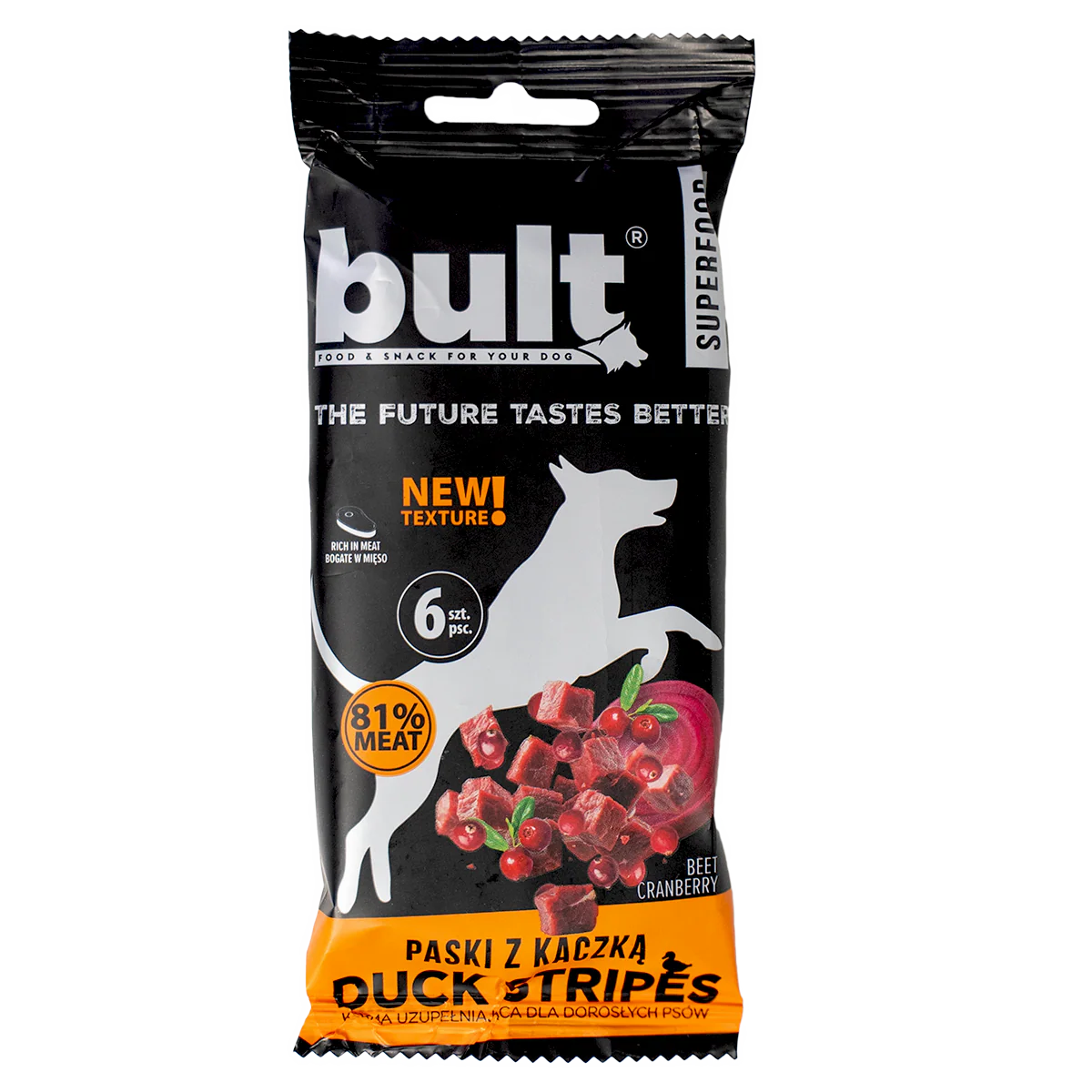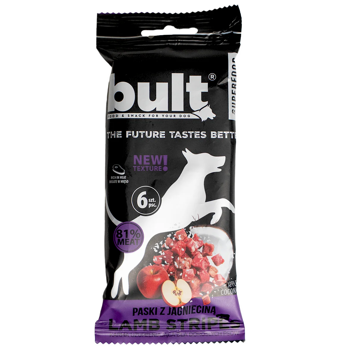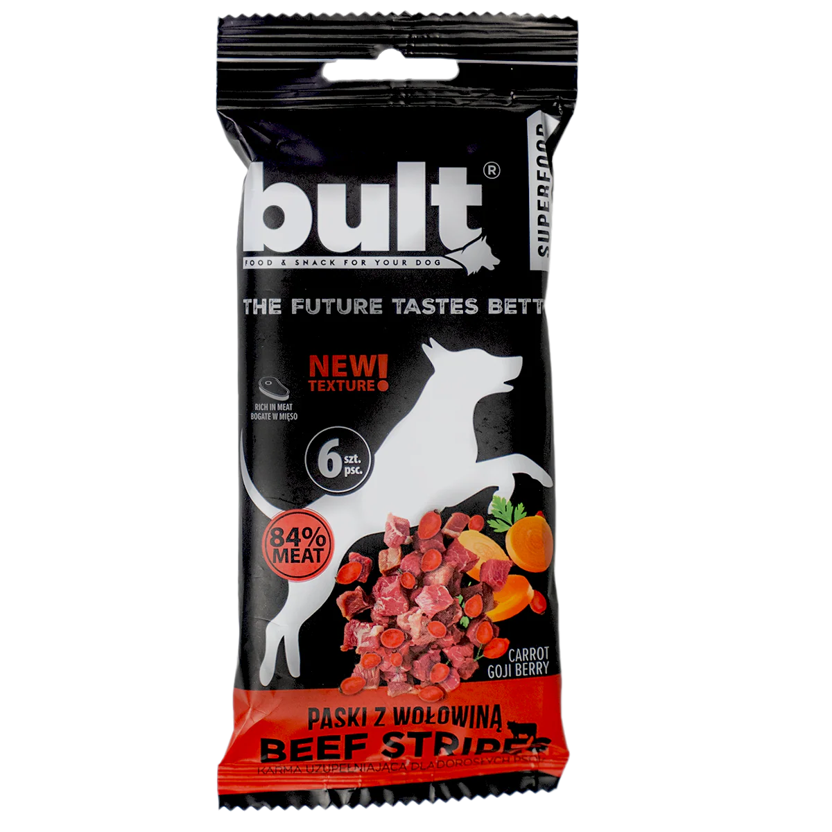 BULT Tasty Strips Superfoods so mehki mesni trakovi za pse, zasnovani kot funkcionalen priboljšek z visoko vsebnostjo mesa in dodatkom superživil. Vsak trak vsebuje kar 81 % mesa in živalskih sestavin, od tega 16 % izbrane vrste mesa (jagnjetina, raca, zajec ali govedina).