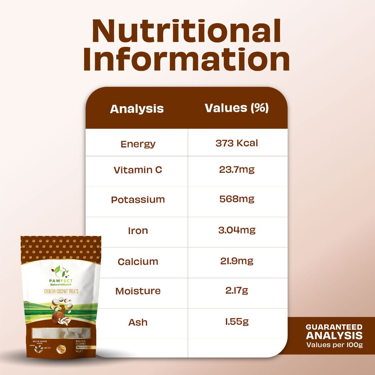 Nature’s Munch – Kokos so hrustljavi liofilizirani priboljški, pripravljeni iz skrbno izbranega kokosa, ki ohranja naravno aromo in hranilno vrednost. Izdelek je brez dodanih konzervansov, umetnih barvil in okusov, brez žit in glutena, vse sestavine pa so primerne tudi za prehrano ljudi (human grade). Liofilizacija zaklene hranila in okus, zato so koščki lahki, priročni in izjemno sprejemljivi tudi pri občutljivih psih.
