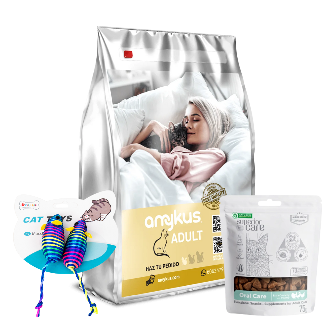 Popoln paket za mačke: kakovostni briketi Amykus Adult , okusni NP Superior Care Oral Care priboljški s perutnino ter zabavna igrača za igro in aktivnost.