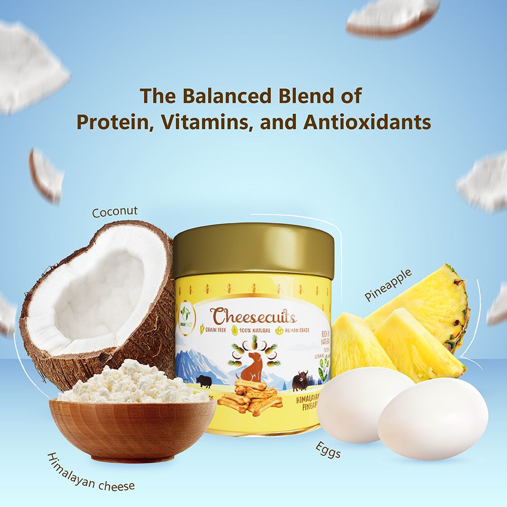 Piškoti z ananasom in kokosom iz linije Pawfect Cheesecuits so prava pasja različica priljubljene Pina Colade – v zdravi, naravni in hrustljavi obliki. Pripravljeni so iz avtentičnega himalajskega sira ter skrbno izbranih tropskih sadežev, ki so znani po svojih številnih zdravstvenih koristih. Vsi priboljški so ročno pripravljeni in nežno pečeni, da ohranijo hranilne snovi in razvijejo prijetno hrustljavo teksturo. Sestavine so primerne tudi za prehrano ljudi in so popolnoma brez umetnih barvil, arom, konzervansov ter žit in glutena.