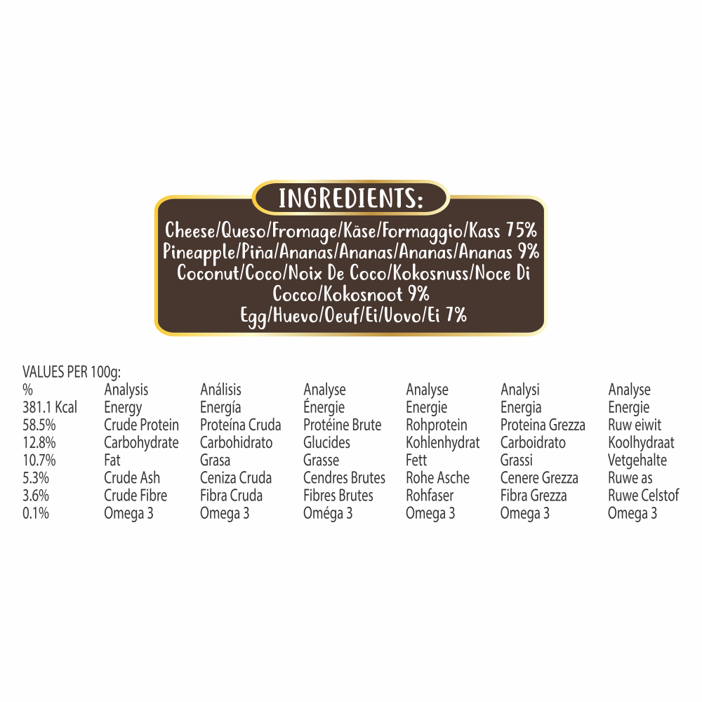 Sir je odličen vir beljakovin, kalcija in vitaminov A ter B12, ki podpirajo močne kosti, zobe in vitalnost psa. Kokos je bogat z antioksidanti in vsebuje laurinsko kislino (MCT), ki pomaga pri presnovi, uravnavanju telesne teže ter podpira zdravo kožo in imunski sistem. Jajce je naraven vir esencialnih aminokislin, vitaminov A, B2 in B12 ter zdravih maščobnih kislin, ki podpirajo energijo in vitalnost. Ananas pa vsebuje bromelain, encim, ki izboljšuje absorpcijo hranil, hkrati pa je bogat z vitamini in minerali za zdrav prebavni sistem in močno odpornost.