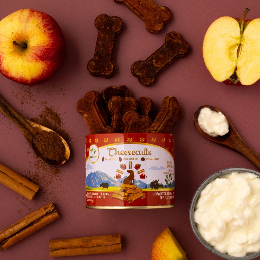 Posebna kombinacija jabolka in cimeta spominja na priljubljeno človeško sladico »crumble«, le da so ti piškoti popolnoma zdravi za pse. Jabolko je vir vlaknin, vitaminov in mineralov, ki podpirajo prebavo in imunski sistem. Cimet vsebuje aktivno spojino cinamaldehid, ki deluje protiglivično in antibakterijsko ter tako pomaga pri zaščiti pred bakterijami, ki povzročajo slab zadah in bolezni dlesni. Sir je bogat z beljakovinami, kalcijem in esencialnimi maščobnimi kislinami, ki podpirajo zdrave kosti, zobe in kožo, jajce pa je naravni vir esencialnih aminokislin, vitaminov A, B2 in B12 ter maščobnih kislin za energijo in vitalnost psa.